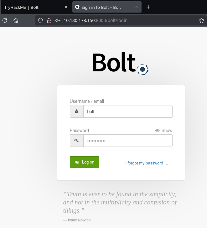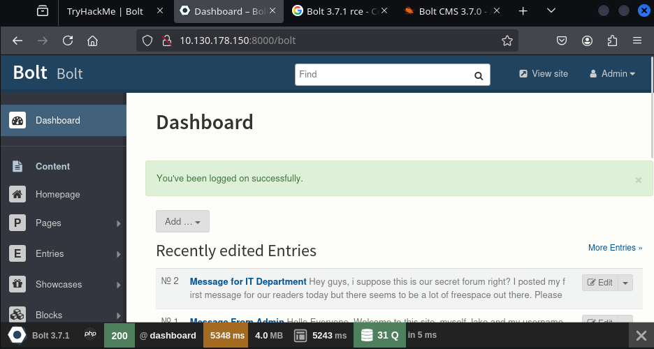 Con estas credenciales probamos rutas típicas de paneles de administración, como /bolt/login, consiguiendo acceso al panel del CMS.