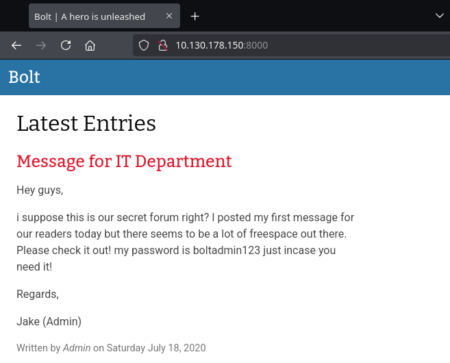 Accedemos al puerto 8000 y encontramos una web funcional. Revisando el contenido, observamos que se filtran credenciales directamente en el apartado de Entries por parte de el administrador.