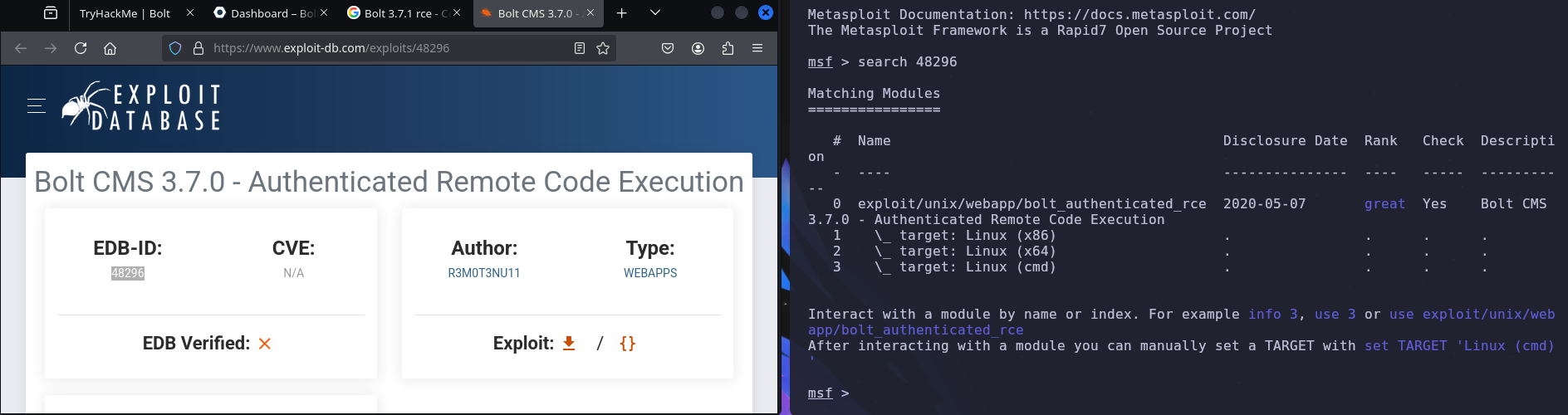 Buscando exploits públicos encontramos uno compatible con la versión detectada, el cual permite RCE autenticado. Para explotarlo utilizamos Metasploit buscando el módulo correspondiente al EDB-ID (Exploit Database ID) del CVE: